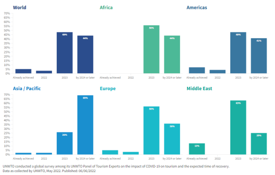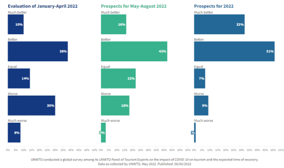 According to the latest UNWTO Panel of Experts survey, an overwhelming majority of tourism professionals (83%) see better prospects for 2022 compared to 2021, as long as the virus is contained and destinations continue to ease or lift travel restrictions. However, the ongoing closure of some major outbound markets, mostly in Asia and the Pacific, as well as the uncertainty derived from the Russia-Ukraine conflict, could delay the effective recovery of international tourism.