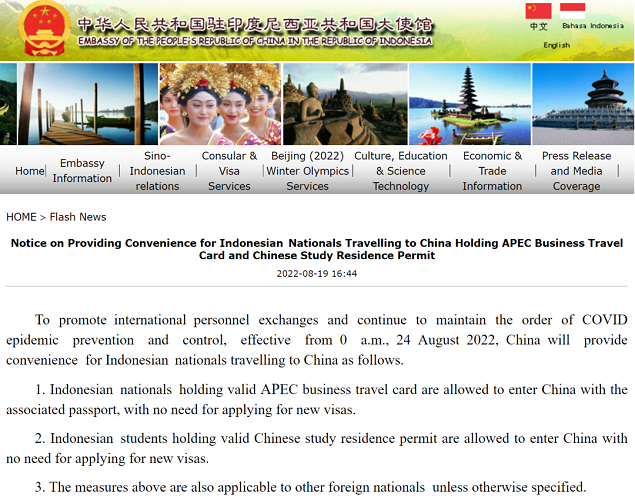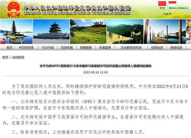 近日中国驻新加坡、尼泊尔、马来西亚等大使馆公布,自2022年8月24日(星期三)0时起,持有效APEC商务旅行卡赴华从事商务活动的外国人及持有效学习类居留许可的外国留学生无需重新办理赴华签证,可持上述证件入境。