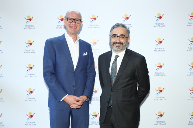 左起:澳大利亚旅游局亚洲市场及国际航司业务执行总经理何安哲(Andrew Hogg)与澳大利亚驻上海总领事戴德明(Dominic Trindade)合影