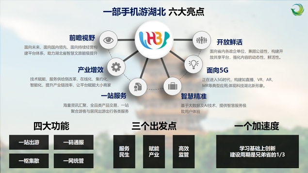 “一部手机游湖北”项目包括“一个中心、两大平台、三大体系”。“一中心”即湖北省文旅大数据中心,“两平台”即“游湖北”平台、政府监管决策平台,“三大体系”即面向G端政府部门的智能化行业监管体系、面向B端企业的精准化营销推广体系、面向C端游客及本地居民的一体化综合服务体系。