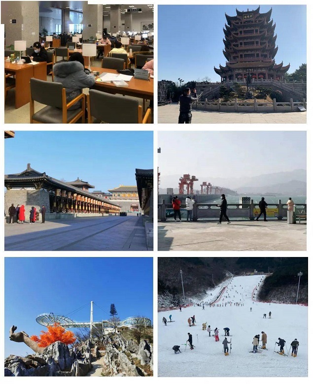 ▲游客通过“游湖北”平台分时预约购票,以上依次为湖北省图书馆、武汉黄鹤楼公园、襄阳唐城景区、宜昌三峡大坝旅游区、黄石天空之城景区及咸宁九宫山滑雪场