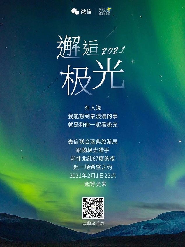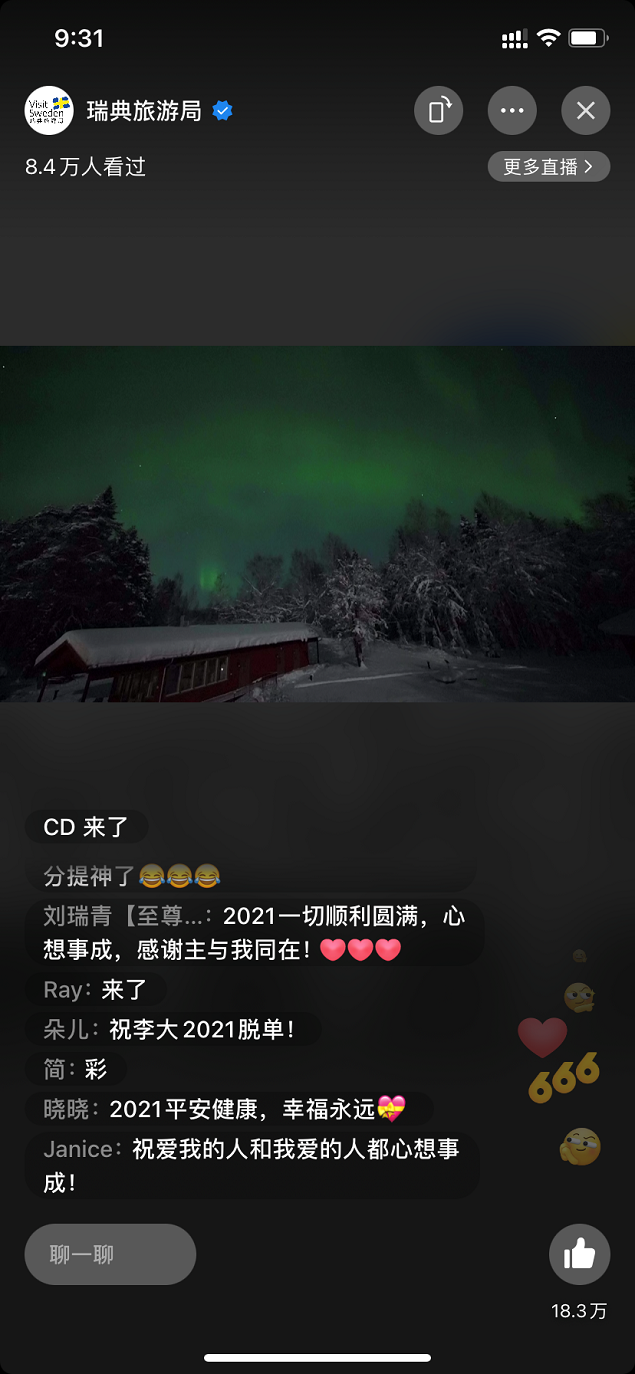 2021年2月1日,瑞典旅游局携手微信官方在微信视频号进行了长达13小时的北极光在线直播。从当日晚间10点到次日上午11点,来自瑞典北部极光胜景的直播收获了26万人在线观看,创造了当月直播人气最旺的记录。