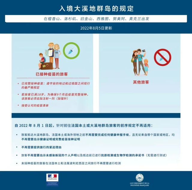 旅客抵达大溪地群岛、法国本土或海外领地之前不再需要完成任何健康申报手续,且无论来自哪个国家或地区,均不再需要出示健康证明或完整疫苗接种证明;