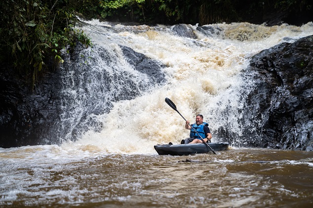 我们上了皮划艇,人工水道水质干净,弯弯曲曲汇入 Juquiá 河。我和巴西美女S的双人艇轻盈悠闲,一路丝丝小雨微微阳光,茂盛的森林与河面融为一体,手抚水面滑行而过,有一种融入大自然的舒心。10米瀑布处水声哄鸣,急流涌下,不怕冷的队友们跃入河中,享受森林之水的洗礼。
