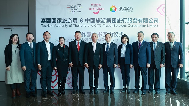 2月22日,泰国国家旅游局与中国旅游集团旅行服务有限公司于北京签署旅游领域合作意向书(LOI)。泰国国家旅游与体育部部长皮帕、泰国国家旅游局局长育塔萨、副局长塔帕尼、中国旅游集团旅行服务有限公司董事长雷海粟一行出席了签约仪式并举行会谈,共同商讨2023年泰国高品质旅游提升与推广相关合作。