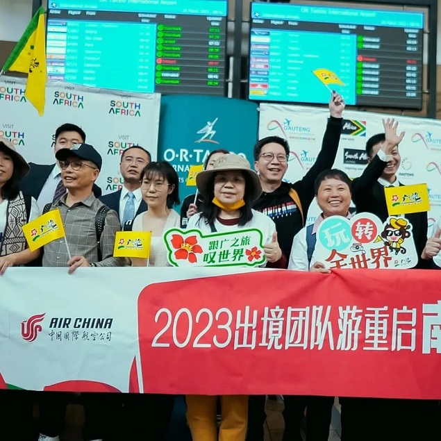 在中国恢复出境团队旅游后,首个乘坐国航前往南非的旅行团按照计划已于3月29日早晨抵达了约翰内斯堡奥利弗·坦博国际机场。首发团受到了南非旅游局首席运营官Nomasonto Ndlovu女士、南非旅游局官员、旅游业者以及当地航空业代表的热烈欢迎。