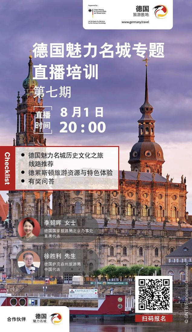 周二(8月1日)晚间,我们将和大家分享德国魅力名城历史文化之旅,带您领略德国的悠长动人的历史与人文底蕴。而后将由德国萨克森州旅游局中国代表徐胜利先生为您介绍德国最美的巴洛克古城——德累斯顿,涵盖老城区与新城区的各色景点,还有新奇的旅游特色体验与可持续旅游的乐趣等待您的探索!