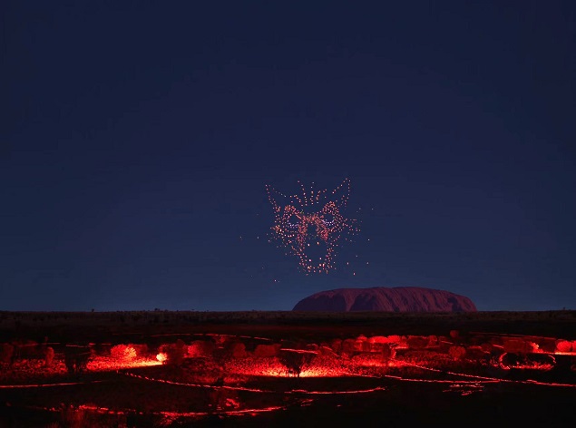 今年五月,澳大利亚原住民旅游公司与当地阿南古原住民社区共同推出了全新的项目一-乌鲁鲁无人机声光秀WintiriWiru(温吉里维鲁,阿南古语,意为“地平线上的美丽风景”),使用先进的激光投影、灯光音乐及无人机,以乌鲁鲁为背景讲述原住民阿南古人代代相传的马拉的故事。表演使用了逾千台无人机,为全澳州最大的无人机表演。