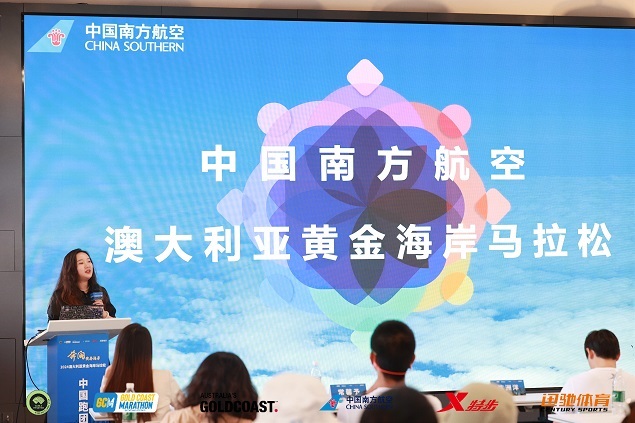 中国南方航空公司近年来一直致力于服务中澳双边经贸、文化、体育、教育和旅游交流事业。作为黄金海岸马拉松中国跑团的独家航空合作方,中国南方航空营销管理委员会马拉松俱乐部项目经理常馨予介绍了以“亲和精细航空服务、助力跑友乐享飞行”为主题的中国跑团专属定制航空服务,其中包括了云端定制互动、专属值机柜台、南航马拉松俱乐部会籍权益以及团队机票折扣等多项福利。此外,俱乐部还精心设计专属机上互动,准备了一系列文创礼品,为参赛者提供独特的飞行体验。特步(中国)有限公司则是继2018年之后、连续第二次为中国跑团提供全套专业跑步装备。主题定制T恤的设计突出黄金海岸的元素,备受现场跑友们的喜爱。此外还包括长、短套装和背包等,其中最亮眼的当属为每位跑者配发的特步160X5.0冠军版跑鞋。在黄金海岸马拉松的赛场上,相信在特步专业装备的助力与加持下,会完美展示中国跑者的速度与风采。