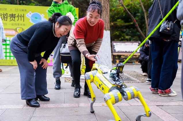 前沿智能科技与贵州特色文旅资源融合的“AI BOT巡游”为身处淡季的贵州旅游市场带来了一抹亮色。以年轻游客和亲子家庭为代表的客群在机器狗的吸引下纷纷驻足观看并积极参与互动。充满科技元素和新奇体验的环节吸引他们拍照分享,让巡游首站黔灵山成为2025年贵州第一个出圈景点,后续活动目的地也成为他们咨询和关注的目标。