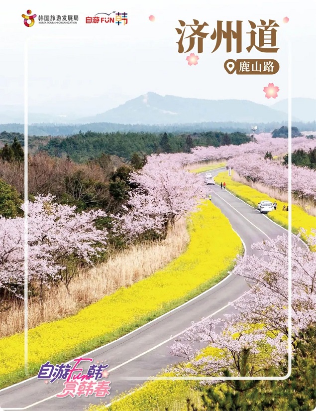 • 介绍:济州岛是韩国境内较早赏樱的地区之一。怒放的王樱花是济州岛春季的一张名片,而由高大樱花和娇小油菜花共同成就的鹿山路则是其中浓墨重彩之所在。鹿山路全长10公里,这里入选了韩国最美的100条道路。明媚春日里,油菜花的金黄和樱花的淡粉足以驱赶一切阴霾寒意,向阳怒放。