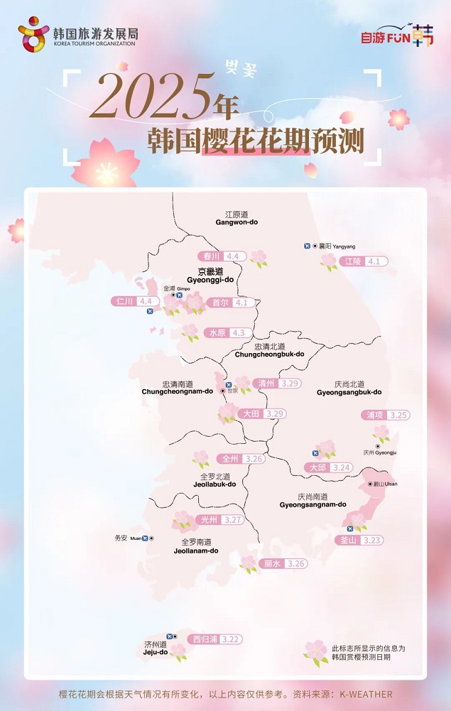 最新出炉的预测显示,2025年樱花花期预计比去年普遍提前3-8天。从最早花开的济州岛(3月22日)开始,釜山(3月23日)、首尔(4月1日)、江原道江陵(4月1日)等地区将依次拥抱蓓蕾初绽。