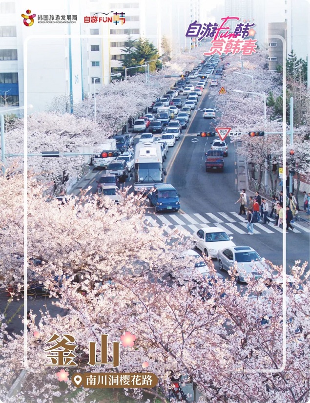 • 介绍:座落在南川洞的这条樱花路从三益海滩公寓一致延伸到到广安里海边。每年3月末4月初,作为釜山市区赏樱地天花板一般的存在,樱粉与大海以及天空的蓝色相融,美不胜收。从这里出发去广安大桥或海云台观看现代城市面貌,或者前去温泉川咖啡街享受惬意的下午茶,亦或是走进釜庆大学回忆学生时光,都是不错的选择。