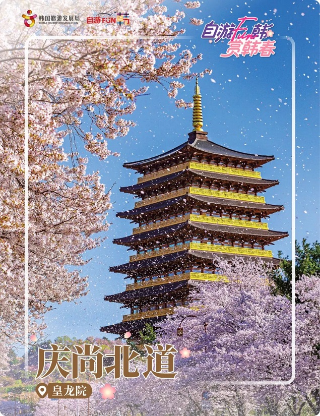 • 介绍:皇龙院墙外的道路每年4月初樱花“火力全开”。而九层中立塔是借鉴新罗时期古塔的样式,重新打造的庆州市新地标建筑。樱花雨和九层塔的相遇,完美诠释了庆州的春日之美。此刻,行走在这座没有围墙的历史博物馆里,在大陵院、东宫月池或者普门湖之间穿梭,尘封的历史被温柔的唤醒,仿佛能听到低声呢喃。