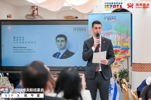 以色列国家旅游部旅游参赞蓝天先生发表了热情洋溢的讲话,他表示:"海南航空北京(首都)至特拉维夫直航的恢复,标志着两国旅游交流进入新阶段。尽管面临诸多挑战,以色列旅游业正展现出强劲的复苏态势。我们已成功重启死海马拉松、耶路撒冷国际冠军马拉松等标志性赛事,并将于5月在特拉维夫举办2025地中海国际旅游展(IMTM)。以色列正以完善的旅游设施和服务,迎接全球游客的回归。