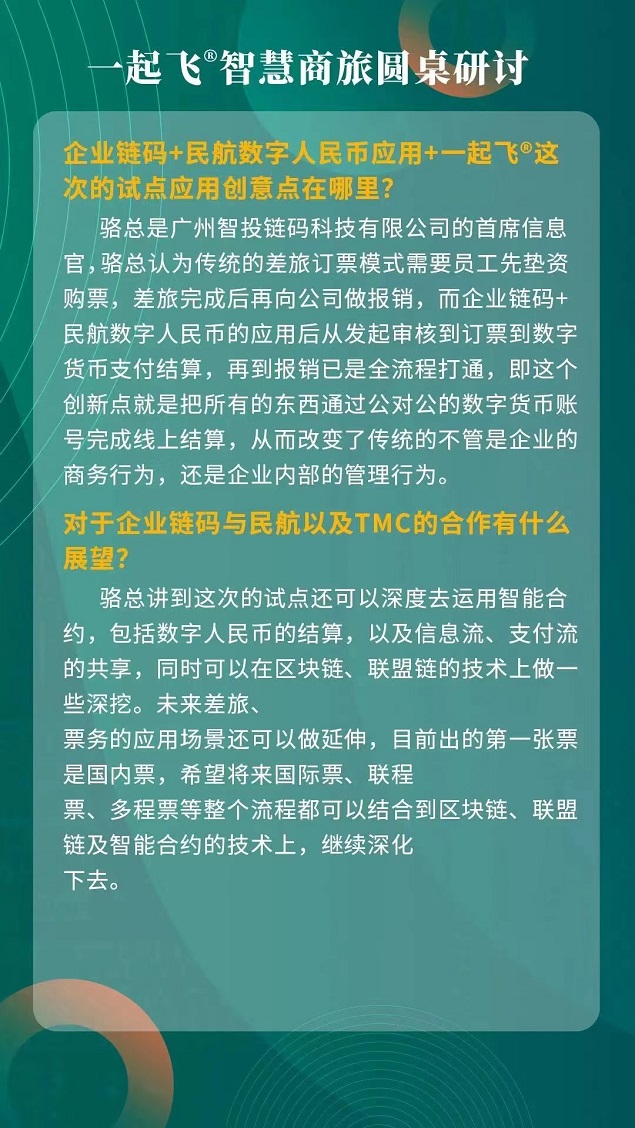 2022年1月21日,在广州民航信息技术有限公司、中国航空结算有限责任公司和中国交通银行领先的金融科技赋能下,一起飞®旗下的商旅管理系统“一起飞®差旅宝”将机票版块上链(包括出票、改期、退票全流程),搭建出区块链智能合约的实际应用场景,由广州智投链码有限公司作为首家数字人民币企业结算合作伙伴在“一起飞®差旅宝”平台完成交易出票,成功实践了B2B领域的数字人民币创新合作模式。