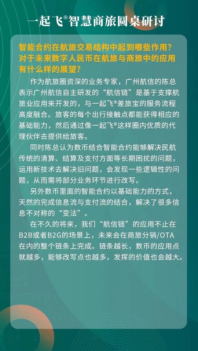 总体来说,对于“区块链智能合约”以及“数字人民币结算”在航旅出行方面的实际应用及其带来的商业变革,五位特邀嘉宾均持积极的态度。创新是持续更新迭代的漫长过程,但任意细节的改变也有可能瞬间带来重大变化。一起飞®非常荣幸能以差旅宝平台率先与各家合作伙伴携手踏出关键的第一步。