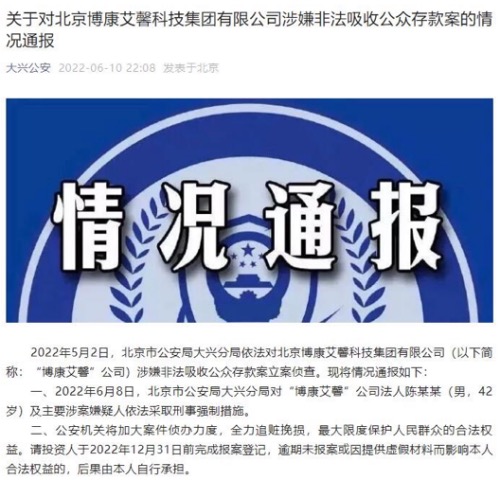 6月10日晚,北京市公安局大兴分局通过官方微信、微博等渠道发布情况通报,2022年5月2日,北京市公安局大兴分局依法对北京博康艾馨科技集团有限公司涉嫌非法吸收公众存款案立案侦查。2022年6月8日,北京市公安局大兴分局对“博康艾馨”公司法人陈某某(男,42岁)及主要涉案嫌疑人依法采取刑事强制措施。