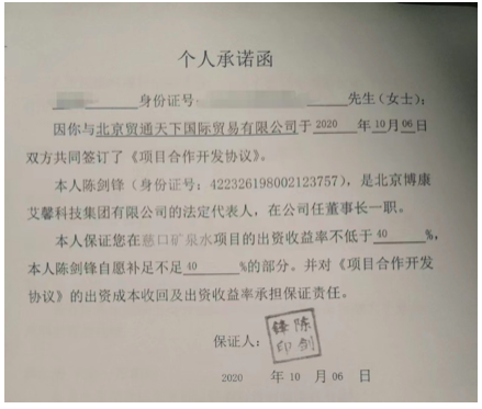 例如,一份通山县慈口乡矿泉水项目开发合作协议书显示,博康艾馨旗下的北京贸通天下国际贸易有限公司与老人签署协议约定,双方合作开发矿泉水项目,项目预计总投入2.8亿元,该老人投资1万元。博康艾馨集团董事长为该合作协议出具了个人承诺函,承诺约定两年收益率不低于40%,不足部分由陈剑锋补足。