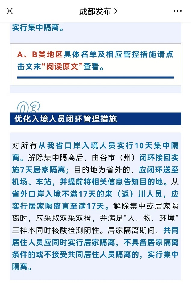 根据成都发布,“对所有从我省口岸入境人员实行10天集中隔离。解除集中隔离后,由各市(州)闭环接回实施7天居家隔离;目的地为省外的,应闭环送至机场、车站,并提前将相关信息告知目的地。”