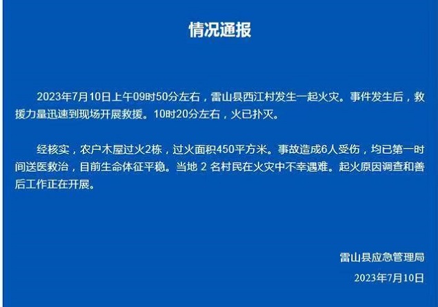 7月10日上午10时左右,贵州西江千户苗寨景区突发火灾。贵州雷山县应急管理局就此事发布通报。全文如下: