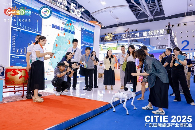 本届旅博会以“智汇文旅提质行动”为核心,聚焦科技赋能文旅发展,12家科技企业同台亮相。中国电信AI伴游助手、广东移动“粤游粤AI”主题应用、邦彦技术NuwaAI智能体数字人、华誉文旅智游车、肯綮科技外骨骼辅助机器人、派宝智能导览机器人等“黑科技”集中亮相;像素芝士景区旅拍解决方案、凡科酒旅服务解决方案等专业化服务,引发行业关注;机器人英歌舞、古筝演奏,机械狗方阵表演吸引观众驻足观看。