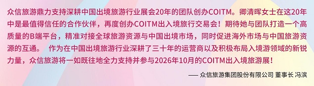 作为中国出境游行业的领军企业和入境旅行的新锐力量,众信旅游集团股份有限公司董事长冯滨对COITM的创办表示强烈支持,并希望“COITM打造成为一个高质量的B端平台,精准对接全球旅游资源与中国出境市场,同时促进海外市场与中国旅游资源的互通。”