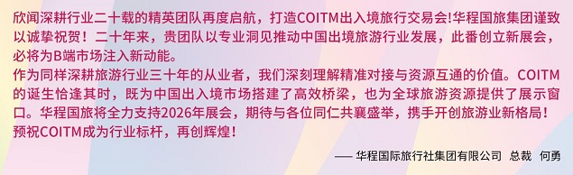 同样,中国出境旅游行业的另一龙头企业,华程国际旅行社集团有限公司总裁何勇也表达了诚挚的祝福与殷切期待,他希望“COITM推动中国出境旅游行业发展,为B端市场注入新动能!”