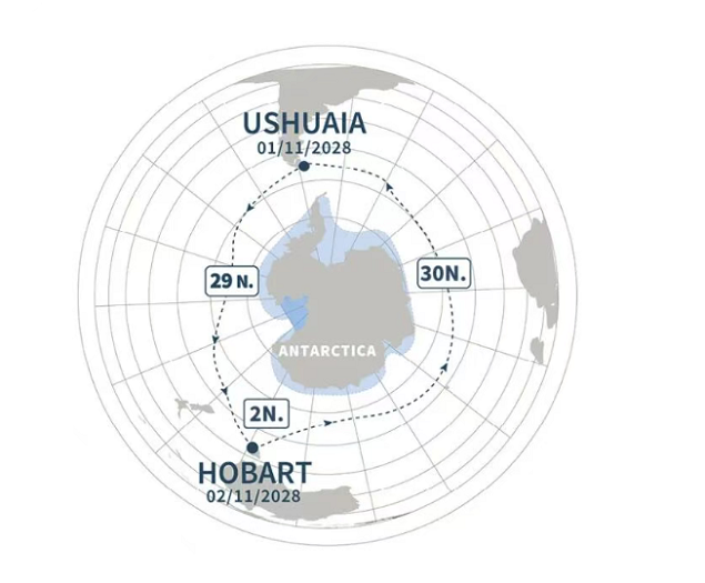 从1773年库克船长首次穿越南极圈却遇冰障折返,到后世探险家凭简陋装备在浮冰间艰难前行,完整环航南极始终是人类极地探索史上的终极梦想。2028年,指挥官夏古号将承载这一梦想,从阿根廷乌斯怀亚出发,航行约11,200 海里(约 18,000 公里),完成一次穿越历史、科学与极致景观的深度远征。此次航线亦是对极地探险精神的一次致敬。