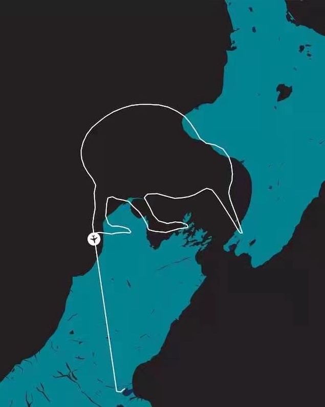 由新西兰航空首席机长大卫•摩根(David Morgan)驾驶的波音787-9梦想客机,于新西兰时间上午11:40从基督城出发,飞往西海岸(West Coast),绕着圈飞越塔拉纳基(Taranaki),沿途转了几个弯,又返回基督城(Christchurch)。至此这个神秘航班NZ4376 (NZHERO)的飞行轨迹终于揭晓—— 云中漫步的几维鸟!