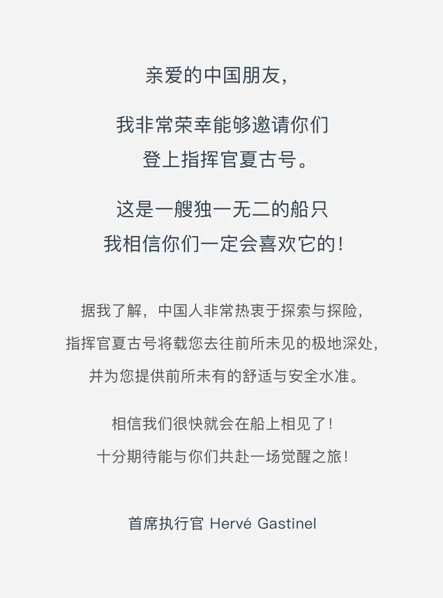 庞洛邮轮首席执行官 Hervé Gastinel 还透过镜头,为庞洛中国的合作伙伴们、旅行家们带来了真挚的问候。