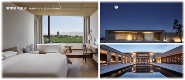 敦煌碧玥酒店坐落在古老丝绸之路的南部,也是敦煌第一家超豪华级别酒店,结合当地的悠久文化打造现代私人度假胜地。碧玥一词在梵语中意为“旷野中的绿洲”,整体设计以丝绸之路和世界文化遗产莫高窟中汲取灵感。酒店位于七里镇鸣沙山月牙泉风景区附近,占地面积 10000 平方米,坐拥独一无二的视野和风景。酒店在设计中充分考虑到了环保需求,采用天然建筑材料打造,简约设计风格与周围环境相协调,自然采光方式,尽可能适用可再生能源和环保设施。这个坐落在沙漠中度假胜地,还拥有自己的葡萄园和有机菜园。客房中铺设简约的大理石,摆放着舒适的沙发,仿佛一个画廊展示着精美的艺术品。户外的水景剧院全年四季都有演出活动,宽敞的客房和套房是仿佛在沙漠和天空北京中的豪华展品。如果您希望获得更浪漫的体验,庭院套房的户外露台上配有电视投影墙,提供观星望远镜。屋顶的 Mirage 酒吧也是该市第一座国际化酒吧,是观赏敦煌金色日落壮观方静的最佳地点。