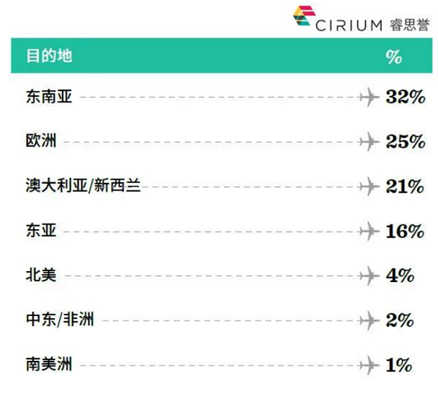 Cirium(睿思誉)的数据显示,在疫情之前,东亚是中国旅客的首选。但是如果你仔细观察这次Cirium(睿思誉)针对中国旅行者的调查报告,就可以发现这种变动的规模——近三分之一的受访者(32%)将东南亚作为他们的选择目的地,是选择东亚的人数(16%)的两倍。
