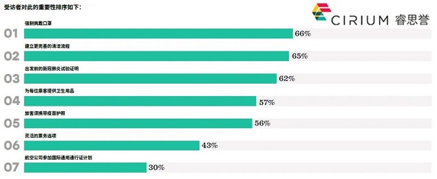 几乎所有受访者(96%)都支持飞行时必须佩戴口罩的强制性规定。大多数受访者(66%)认为,口罩要求是选择航空公司时的一个重要因素,另外还有清洁程序的质量(65%)。