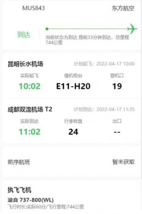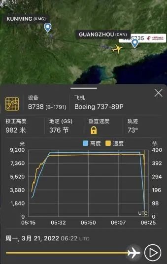 该飞机编号为MU5735的客机,为波音737-800型,机龄6.8年。于3月21日13:15分从昆明长水机场起飞,计划在14:54分抵达广州白云机场。