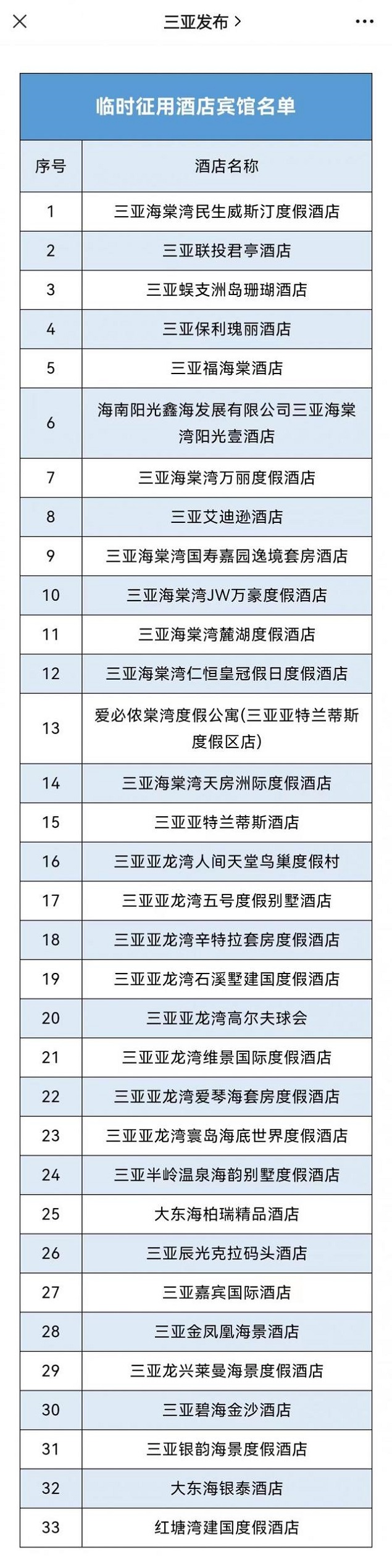 三亚临时征用33家酒店做隔离场所 其中不乏顶级豪华酒店