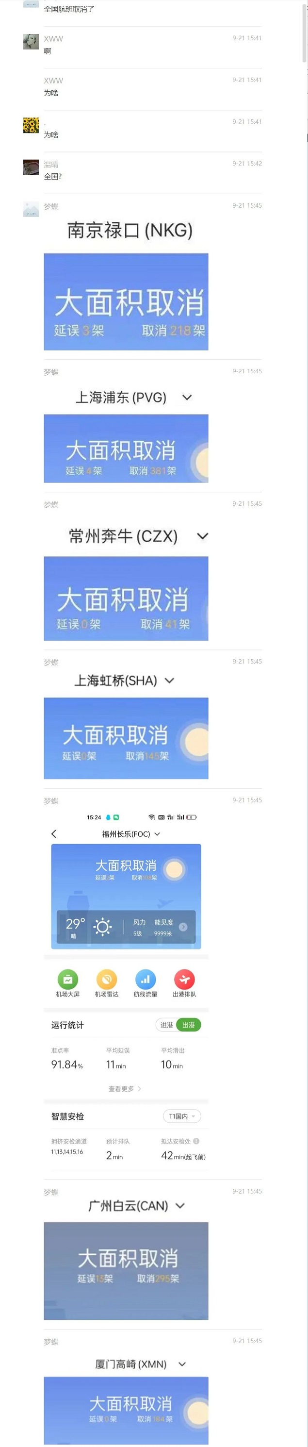 昨日,一段聊天记录在多个微信群里传播,里面提到“全国航班取消了”。