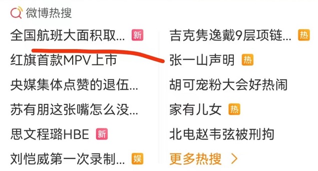 FATIII指出,一是涉及的领域平时关注度相对不高,除了日常会上诸如飞常准等三方数据统计APP翻一翻的业内人士,普罗大众对这种情况并不了解;二是“全国航班取消”的用语足够惊悚,也足够热心网友吃瓜围观;三是紧贴时事热点,疫情等都足以让围观群众插上想象的翅膀。