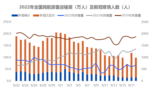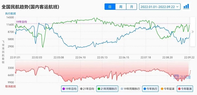 关于“航班大面积取消”一事,飞常准表示:全国航班状态基本稳定正常,未出现明显波动,大面积取消主要还是因为疫情的影响,已经持续一段时间了。飞常准数据显示,2022年9月12日-9月18日,民航旅客量波动回升。周执行客运航班3.9万班次,日均5573班,环比上升15%,同比2021年下降47%,较2019年下降58%。周运输旅客量428.4万人,日均61.2万人,环比上升19%,同比2021年下降49%,较2019年下降66%。周执行率33%,环比回升5个百分点。最近两日全国客运航班呈现平稳状态。