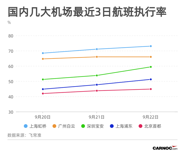 从机场看,北京首都、上海浦东/虹桥、广州白云、深圳宝安这几大机场9月20-22日三天的客运航班总执行率是平稳增长的。