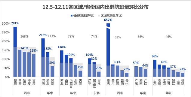具体从区域上看,西北地区国内出港航班量环比增长168%,成为疫情放松管控后最大的受益区域市场,其各省份环比增幅皆超过100%。