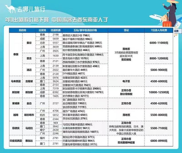 值得一提的是,1月末至2月初,从中国香港飞往马来西亚吉隆坡、泰国曼谷、新加坡等东南亚地区,价格均在从广州出发一半以下。另一个高性价比的出游方式,是购买旅行社的自由行产品。2月6日,旅行社出境团队游业务试点恢复,旅行社及在线旅游企业可开展出境团队旅游和“机票+酒店”业务。泰国、印度尼西亚、柬埔寨、菲律宾、马来西亚、新加坡等国家在首批名单中。