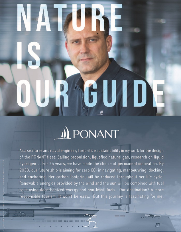 作为一名海员和造船工程师,我在设计庞洛船队时总是将可持续性放在首位考虑。风帆推进、液化天然气、液态氢研究……35年来,我们长期坚持创新。到2030年,我们对于未来新船的目标是在航行、操纵、对接与锚泊的过程中实现二氧化碳的零排放。她的碳足迹将在全生命周期内被削减,以可再生能源(风能、太阳能)与低碳非化石能源(燃料电池相关)相结合。我们愿驶向更负责任的旅游业,虽然这并非一蹴而就之事……但我们愿意为这趟不凡的旅程付诸努力。