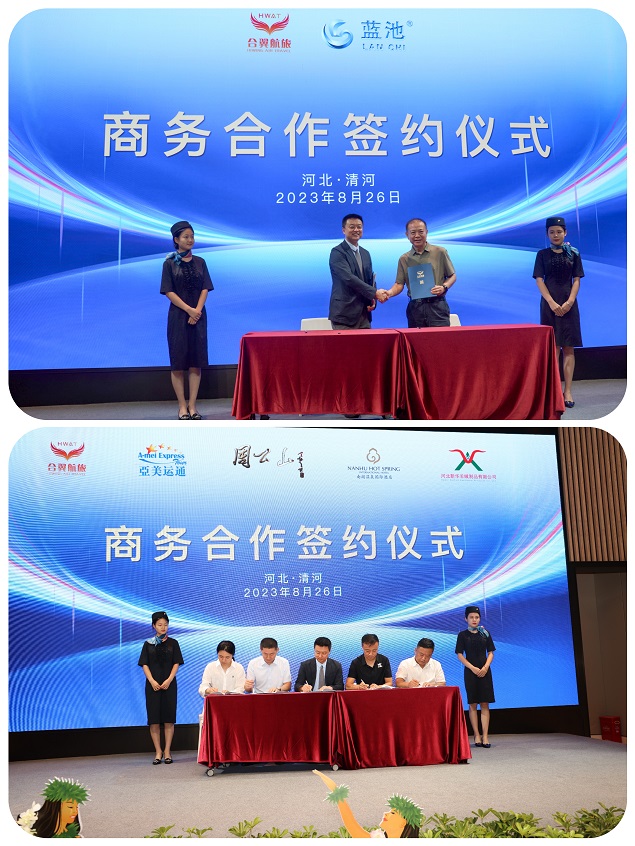 合翼航旅集团与亚美运通国旅、南湖温泉国际酒店、周公山旅游资源开发有限公司、河北新华羊绒制品有限公司共同达成了航空旅游战略联盟协议。