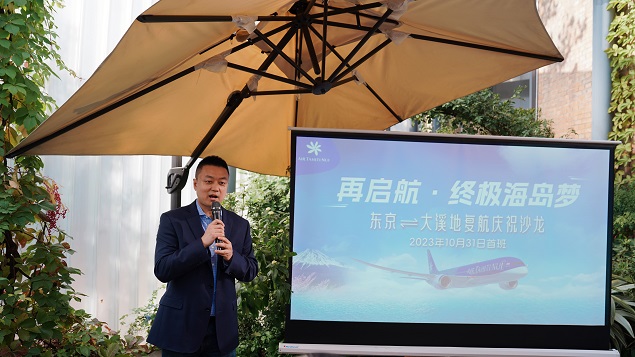 大溪地航空公司中国区代表王晓冬先生对大家的到来表示了欢迎,并表示“很高兴今天与老朋友们在线下相聚,市场的开放与此次东京-大溪地航线的复飞,意味着我们挺过了最艰难的时期,希望与大家共同努力,搭配更好的产品,也期待有越来越多的朋友,搭乘我们大溪地航空的梦想客机前往这个终级梦想之地。”