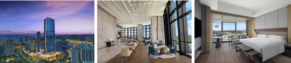 从左至右:武汉襄投万豪酒店外观图、豪华大床房、大堂