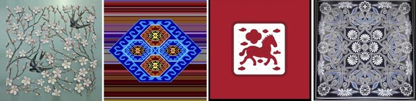 从左至右:布糊画:春来燕归·万象更新、西兰卡普:48勾·迎新纳瑞、壮绣:马上大吉·开挂人生、枫香染:卷草纹图·悦纳如意
