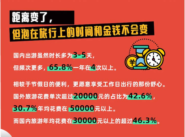 根据大数据报告显示,在国内游全面开放前,穷游网用户就计划着出行。2020年3月以来,穷游网站内国内目的地浏览量月增长率甚至超过了400%,7月后,行程助手行程规划月增长率超过40%。83%出境游的用户转变为国内游,即使无法出国,但用户花在旅行上的时间和费用基本不变。相较于国外一次出行时长多在8天以上,国内出游虽时长多为3-5天,但频次更多,65.8%的用户一年在4次以上。此外,在旅游花费上,有46.3%的用户国内旅游年均花费超过30000元。