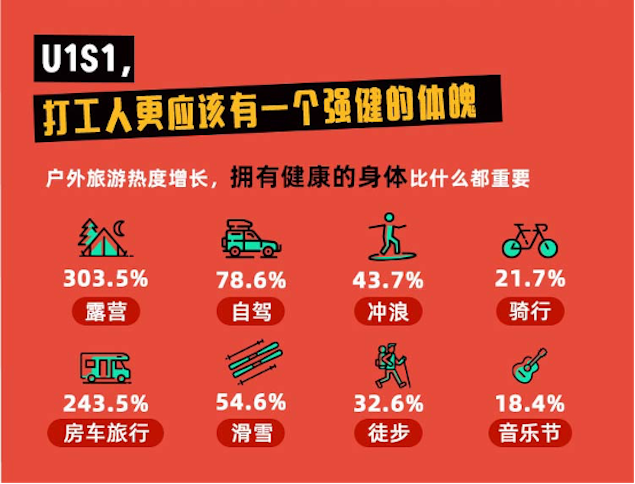 此外,户外旅游的热度今年也迎来了快速增长。魔幻的2020年,让人们更加意识到拥有一个健康的身体最重要。从数据来看,露营热度增长303.5%、房车旅行热度增长243.5%、自驾游热度增长78.6%、滑雪热度增长54.6%。