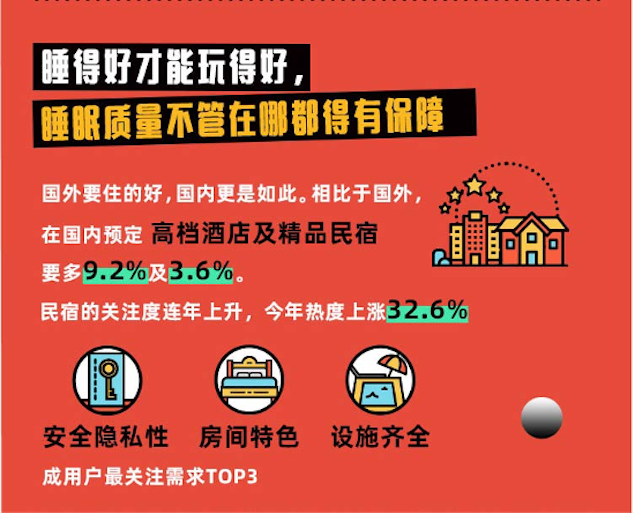 追求高品质旅游体验的穷游用户,对于入住酒店的要求也很高。相比于国外,在国内预定高档酒店及精品民宿的用户要多9.2%及3.6%。相比“千店一面”的酒店,强调个性化的民宿成了越来越多游客的新选择,今年民宿热度上涨32.6%。而安全隐私性、房间特色及设施齐全成为用户在民宿预定时,最为关注的三大因素。
